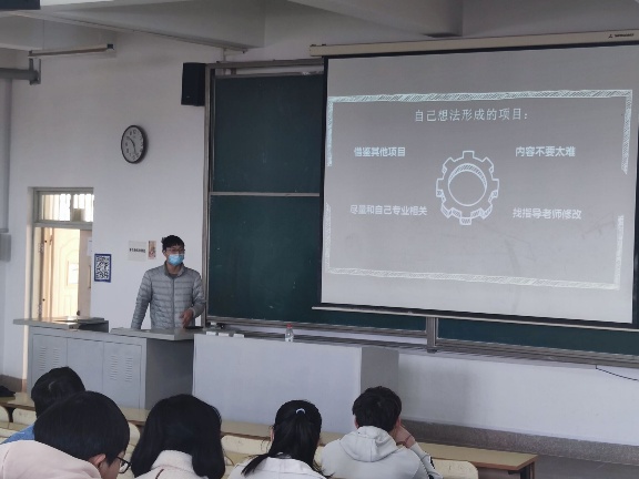 活动伊始,黄号向同学们简要介绍了科研立项的流程,即前期提交项目申请表、中期检查和第二年学期末结题。谈及参与科研立项的原因时,他指出,科研立项不仅是含金量较高的比赛的敲门砖,还能帮助你认识更多志同道合的朋友、体会合作的魅力。随后,黄号详细讲解了如何进行科研立项的选题。他强调应当优先考虑参与老师正在进行的科研项目,如果是根据自己的想法形成的项目,也要尽量选择与所学专业相关的内容,并且及时请教指导老师。针对同学们在项目经费、如何联系指导老师等方面的问题,黄号也一一解答。最后,张承进老师对本次班会进行了总结,鼓励同学们积极参加科研立项,并表示愿意为同学们推荐指导老师。