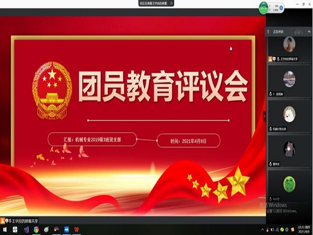 4月8日下午,19级机械设计制造及其自动化03班成功举办线上团员教育评议会议,会议由团支书王学良主持,19级机械设计制造及其自动化03班全体同学参加。