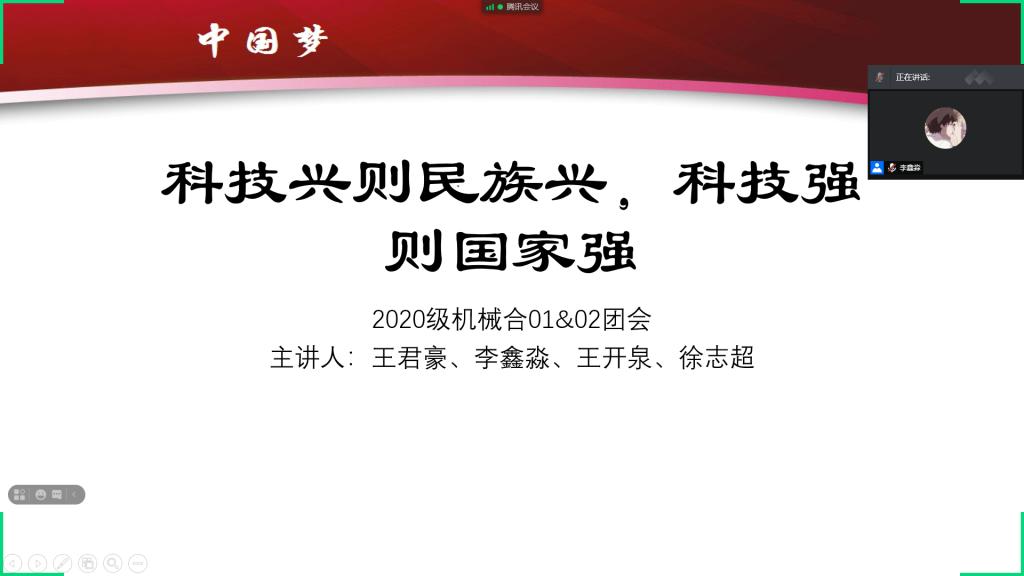 3月31日,机械合1、2班在腾讯会议开展“科技兴则民族兴,科技强则国家强”线上主题团日活动。该活动由王君豪、李鑫淼主持,机械合1、2班全体成员参加。