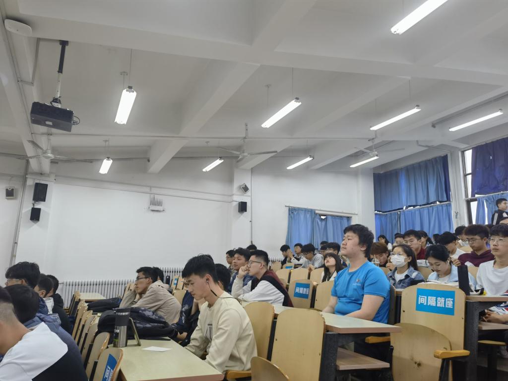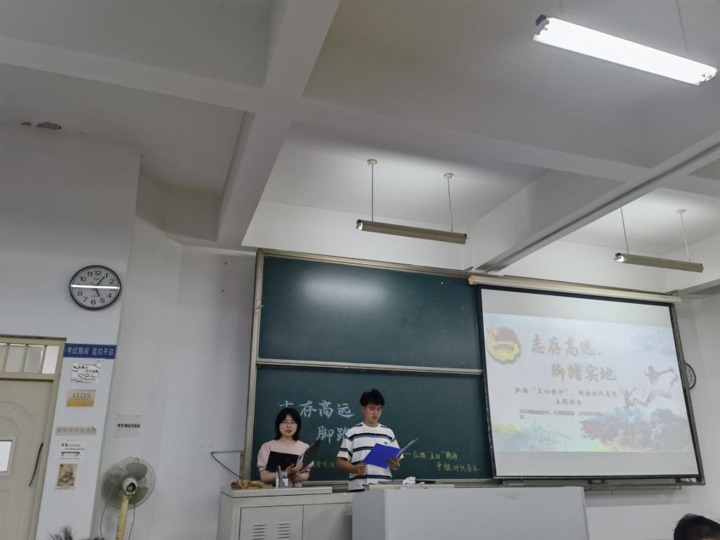 首先,主持人向同学们介绍了五四青年节的起源,并详细解读了五四精神的含义,主持人说,五四精神不仅反映出五四运动不同于此前近代中国民主革命的新意,而且反映出五四时期那一代时代先锋的崭新人格特征。随后,主持人播放了短片《想成为什么样的人》,几分钟的视频令同学们陷入深思,同学们带着“想成为什么样的人”的疑问,进入了五四精神的学习。接下来,由陈曈、王开泉、李闻天三名同学讲述了不同岗位不同身份的五四青年代表的故事。三位同学用沉稳的声音将故事娓娓道来,让同学们深深感受到中国青年的力量。主题团日第二部分,李鑫淼、王君豪、赫明佳、孟鸽四名同学带来朗诵《青春的旗帜》,他们清晰洪亮的声音展现了青年人的自信和斗志;姜佳男老师带来五四精神主题讲座,他强调青年应从小事做起,培养自身品质,树立正确的人生目标,并为之奋斗。主题团日第三部分,聂子涵,赫明佳及其舍友等五名同学带来歌曲《蜕变》,充满正能量的歌声唱进每个同学心中,激励同学们坚持梦想勇于改变。最后,主持人为大家分发明信片,让大家写下对自己的青春寄语并进行了集体宣誓,留下对国家的承诺。