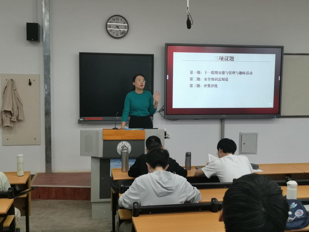 李倩老师首先向同学们讲解了国庆假期的放假安排,指出原则上国庆假期依旧不得离开校区驻地。接着,向同学们介绍了学校即将举办的趣味运动会,运动会即既可丰富同学们的课余生活,又可提高同学们的身体素质。同时,李倩老师向同学们说明大学生除了要提高身体素质,心理健康也很重要。大学生处于人生思想碰撞最激烈的时期,很多同学在此时感到迷茫和焦虑,因此一定要注重自身的心理健康。然后,李倩老师又向同学们介绍了近期开展的评奖评优事项,请同学们关注学业、特长等奖学金的评议情况。最后,9月30日是全国第八个烈士纪念日,在这个特殊的日子里,鲜花献给英烈,李倩老师也带领同学们观看了相关的爱国主义视频,并教育同学们要好好学习,吾辈自强。