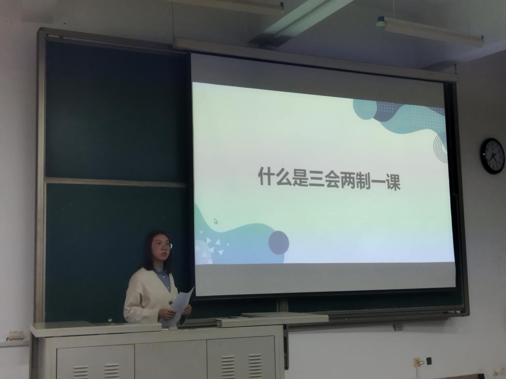 活动伊始,王旭阳总结了在过去一年里班级开展过的团务活动。接着,通过PPT带领大家学习共青团的“三会两课一制”,为大家介绍了“三会两课一制”的详细内容和流程。“三会两课一制”有着完善的规章制度和健全的组织机构,对我们的学习、工作和生活有着重要的指导作用。王旭阳对”三会两课一制“的细心讲解增强了同学们的团员身份意识,同学们纷纷表示,要为团支部建设献出自己的一份力量。其后,王旭阳提到,我们作为共青团员,应该重视“青年大学习“网上主题团课学习,深入学习领会习近平新时代中国特色社会主义思想,增强学习意识、团员意识。