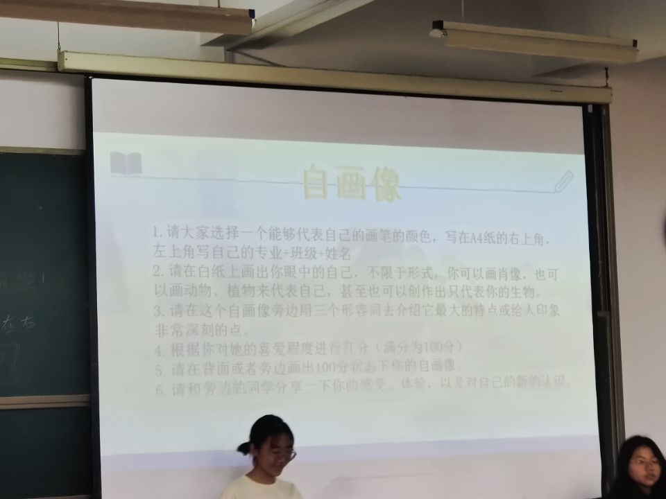 活动第一部分为“绘制自画像”,班上每个人都选择一个代表自己的颜色,写在A4纸的右上角,在白纸上画出眼中的自己。然后在这个自画像旁边用三个形容词去介绍它的特点,根据喜爱程度进行打分,最后在背面或者旁边画出100分状态下的自画像。通过绘制自画像,每个人都对自己有了更深刻的认识,而和旁边人的交流,更是给了同学们相互了解,确立正确方向的机会。