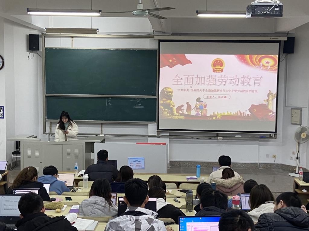 主持人从“充分认识新时代接班人对加强劳动教育的新要求”,“全面构建体现时代特征的劳动教育体系”,“广泛开展劳动教育实践活动“,“着力提升劳动教育支撑保障能力“,“切实加强劳动教育的组织实施”等五个部分讲解了全面加强劳动教育的重大意义和组织实施等。最后,宋暖对同学们进行了教育。同时勉励同学们要努力学习,团结同学,共创美好明天。