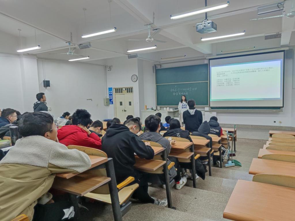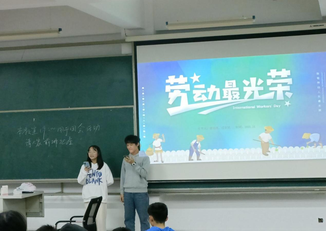 为弘扬劳动精神,帮助同学形成正确的劳动观念,11月28日晚上7点,2021级计算机类1、2班在商学院447举办了“劳动最光荣”主题团日活动。本次活动由1、2班团支书汪宸旭、唐钰琪主持,1、2班全体同学参加。