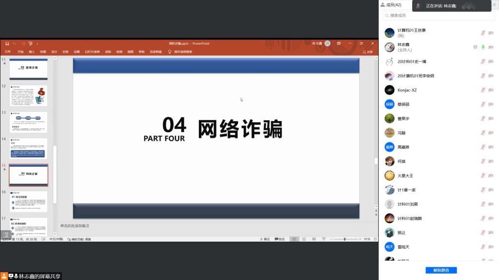 疫情期间,同学们线上活动增多。为了防止同学们遭受网络诈骗,3月16日下午,20级计算机1班召开了“提高防范意识,严防网络诈骗”线上专题学习会。团支书林志鑫主持会议并讲话,全班同学参加会议。