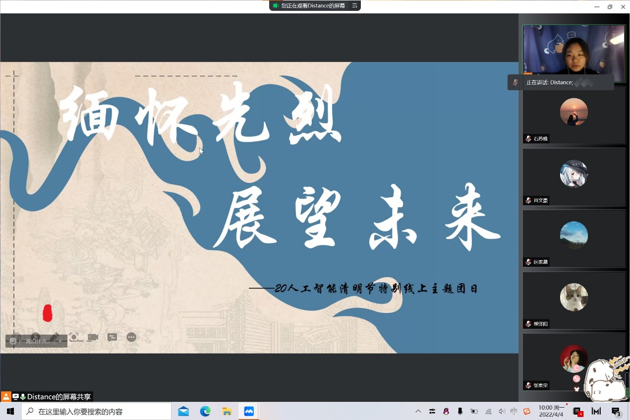 4月4日上午,20级人工智能开展“缅怀先烈,展望未来”清明节线上特别主题团日活动,活动由班级团支书苗晴主持,全体同学参与。