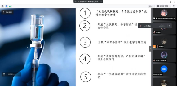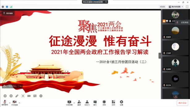 此次主题团日活动全程线上进行。活动分两个阶段、两个主题开展。分别是“众志成城同抗疫,青春聚力勇担当”疫情防控主题和“学习两会精神,担当青春使命”主题。