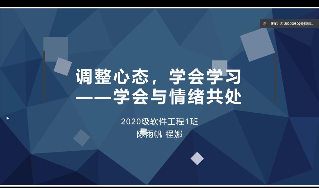 4月3日,20级软件1班使用腾讯会议线上的方式举办了“调整心态,学会学习”——学会与情绪共处主题心理班会,本次班会由20级软件1班心理委员陈雨帆、程娜主持,20级软件1班全体成员参与。