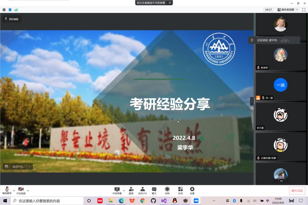 为帮助同学们提前了解当前考研形势,分析考研动态,传授考研经验,以便让同学们更好地抓住考研重点,明确未来方向,4月8日晚,20级计算机澳2班召开了以考研经验分享为主题的科研班会。会议由班主任曲美霞老师主持,章逸民、梁宇华、聂家玉三位2018级学长学姐作为分享嘉宾,全班同学与部分其他专业同学共同参与。