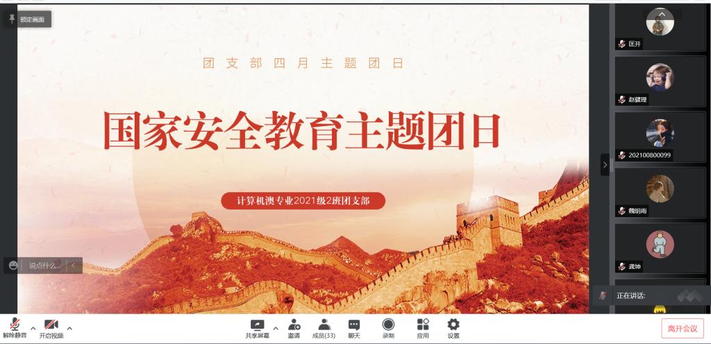 2022年4月16日星期二计算机澳2班团支部开展了线上的国家安全教育主题团日。本次主题团日,同学们线上观看了由主持人讲述了关于网络安全等国家安全教育。