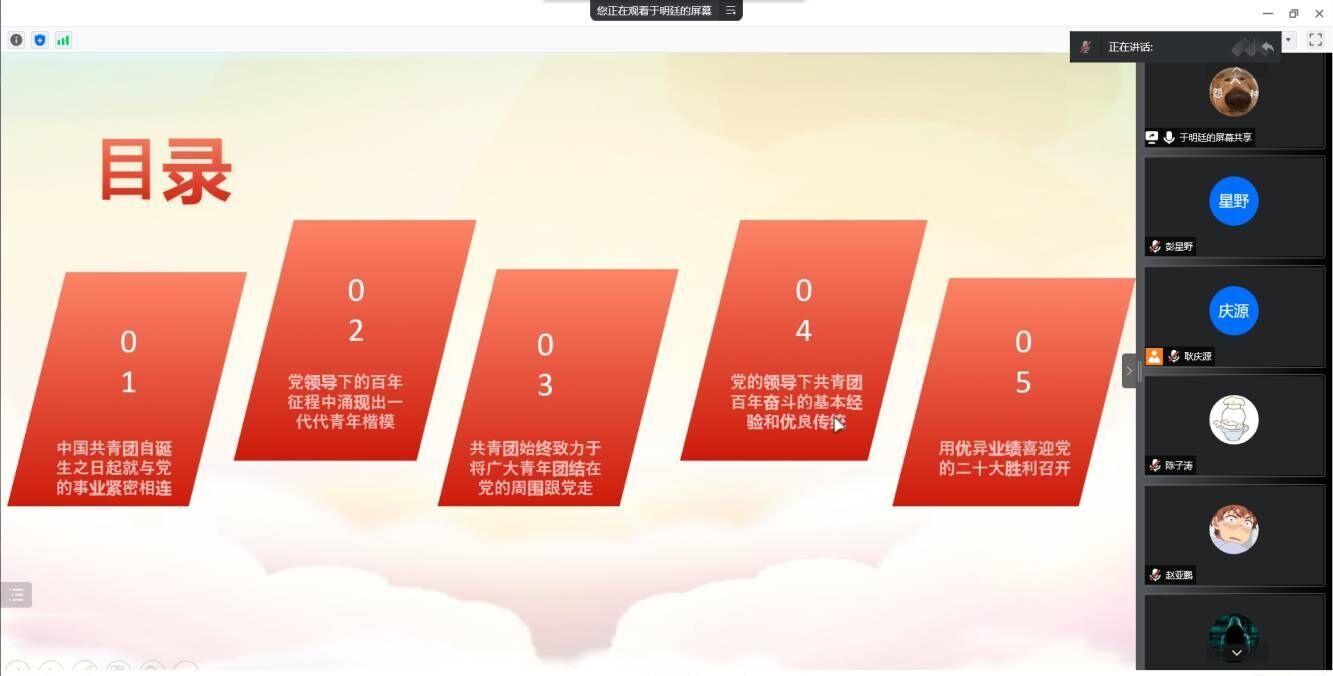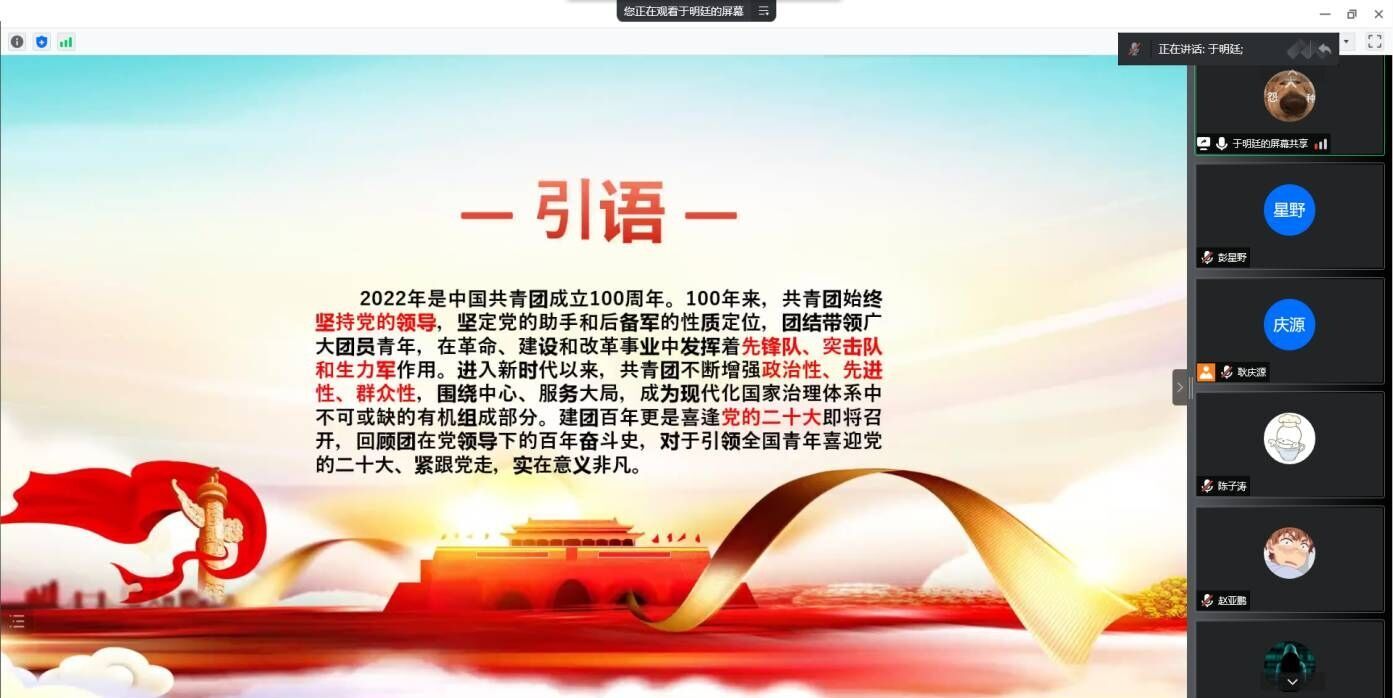 活动伊始,于明廷带着大家回顾了党的青年运动史。共青团诞生于革命战争时期,自诞生之日起就与党的事业紧密相连。同时担负着团结青年,组织青年和充分发挥党联系青年的桥梁和纽带作用。活动第二部分,学习青年楷模的奉献精神。从不忘初心、牢记使命,把生命定格在扶贫路上的黄文秀,到卫国戍边、筑魂喀喇昆仑的青年战士陈祥榕、王焯冉、肖思远;从平均年龄只有30岁到33岁的“天宫”“蛟龙”“嫦娥”科研团队,到北京冬奥会、冬残奥会上为国争光的冰雪健儿……一代代青年以青春之我,建设青春之政党、青春之民族、青春之国家,在奋进中绽放了最美的青春之花。活动第三部分,总结共青团百年奋斗的基本经验和优良传统。共青团呈现出蓬勃向上的趋势,得益于坚持党对共青团的全面领导、得益于共青团发挥青年的先锋作用、得益于从严治团。