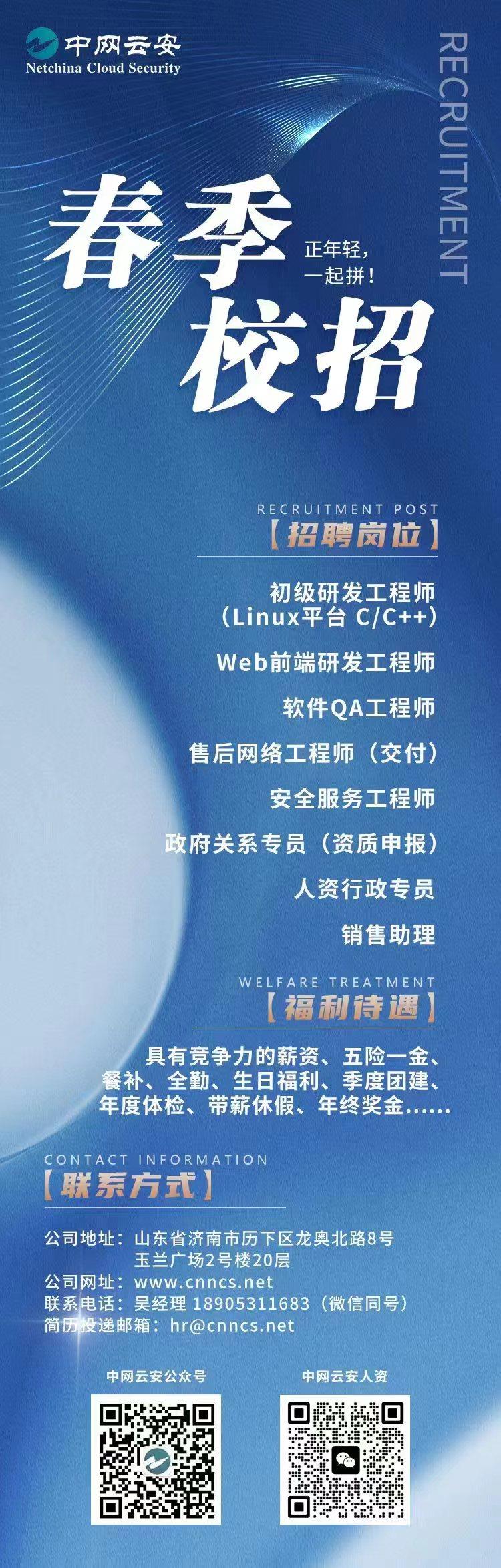 山东中网云安智能科技有限公司成立于2016年,是一家专业以信息安全等级保护、工业互联网安全及信息技术应用创新为主营业务的国家高新技术企业、国家涉密信息系统集成企业和国家信创目录入围产品研发、生产、销售及服务的资格企业。公司内设网络安全攻防实验室和山东省信创综合适配中心,拥有核心稳定的研发队伍和强大的大数据及云计算能力,时刻监测来自于互联网的各种攻击风险和病毒疫情,可为全国行业客户提供信息安全攻防演练、应急支撑、安全运维、安全保障等在内的最快速响应和高效服务。