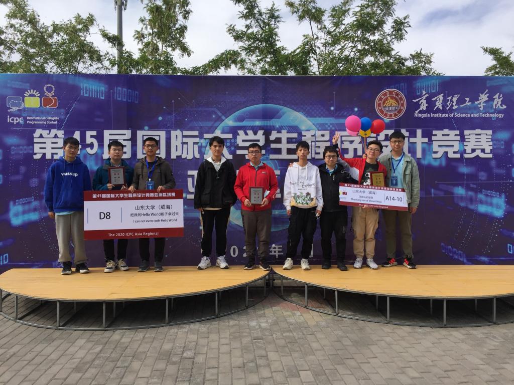 值得庆祝的是,在2021年5月15-16日举办的银川线下赛中,也是本赛季最后一场比赛,校区学生取得历史性的好成绩,为本届赛事画下一个圆满的句号。其中,由李朝阳、肖龙、于帅聪组成的“玛迦山的朝阳”眼疾手快,在开场40分钟零失误拿下A题与E题。随后题目代码出现些许失误,浪费了一些时间,不过他们马上调整心态,找出错误,马上又拿下K题与J题。中场过后发现G题可做,他们及时讨论思路,在几次尝试后成功拿下G题,最终以5题总排40名,为校区拿下史无前例的第一枚金牌。同场比赛的另两支队伍同样不甘人后,由18计算机李济帆、18软件工程王筱童、17软件工程曾鹏武组成的“玛迦山的LCY”和19空间科学祁盛文、19软件工程孙天琦、19计算机(中澳合作)陈龙泽组成的“把我的Hello World板子拿过来”队伍分别拿下4题和3题,再度夺得两枚铜牌。