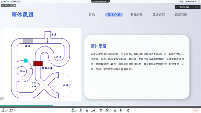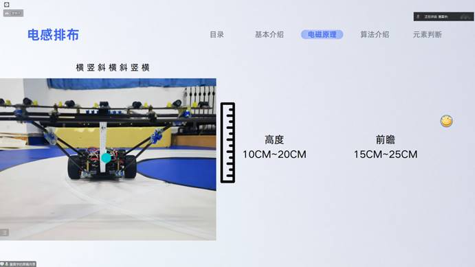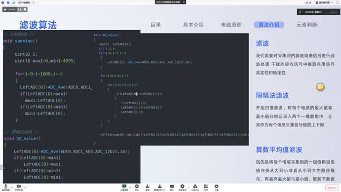 在培训开始时,董昊宇向同学们介绍了电磁组的基本情况,并带领同学们认识了电磁床干起的基本原理。随后董昊宇同学着重讲解了电感的排布策略和技巧,带领了同学们学习了滤波的意义及两种非常实用的滤波算法——限幅法滤波和算数平均滤波,并介绍了归一化和差比和的目的和方法并针对如何控制电机进行了讲解。最后,董昊宇针对两个难度较大的元素环岛和断路,给出了自己富有启发性的处理方法,使同学们在培训中收获成长。
