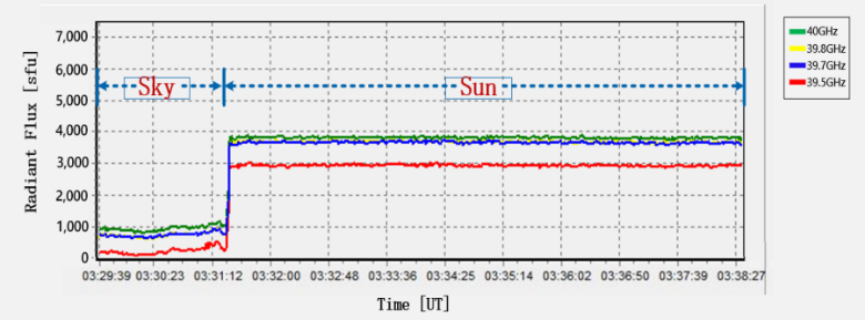 该仪器通过安装在同一个平面支架上、基线距离230倍波长的两支天线接收太阳辐射信号,天线为50厘米口径、圆极化卡塞格伦式。仪器以归零干涉的方式抵消宁静太阳的辐射,可有效降低宁静太阳辐射对应扰动信号,进而实现对耀斑辐射的高灵敏监测。仪器主要参数如下:观测频段为39.5-40GHz,频率分辨率为153kHz,时间分辨率为0.1ms,模拟前端噪声系数≤2.1dB(170K)。