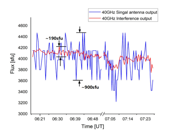 地球大气的湍动、云层变化、水与氧气分子等对太阳微波辐射信号有着直接影响,使太阳射电信号经地球大气到达天线时,含有受大气吸收和湍动影响的“抖动”分量,产生噪声干扰,限制了毫米波太阳爆发信号探测的灵敏度,对于小耀斑事件的探测影响尤为严重。为减弱大气引入的太阳辐射信号噪声,有效提升耀斑射电信号测量的抗扰能力和灵敏度,实现在40GHz频段对太阳耀斑的有效监测,团队提出并成功研制39.5-40GHz毫米波太阳射电两元干涉仪。