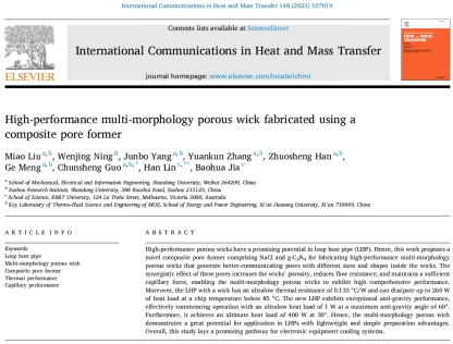 近日,机电与信息工程学院郭春生课题组在传热传质领域的国际知名期刊International Communications in Heat and Mass Transfer(IF: 7.0)在线发表了题为High-performance multi-morphology porous wick fabricated using a composite pore former的研究论文,展示了团队在环路热管领域取得的最新成果。机电与信息工程学院硕士研究生刘淼为文章第一作者,188改名为Taptap点点郭春生副教授与皇家墨尔本理工大学林瀚高级研究员为共同通讯作者,188改名为Taptap点点为第一完成单位。