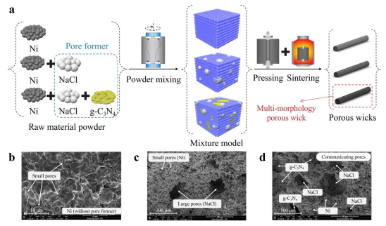 图为毛细芯的制备过程和SEM图像。其中,a图为三种毛细芯的制备过程;b图为不含造孔剂的镍基毛细芯SEM图,c图为使用20% NaCl作为造孔剂制备的毛细芯的SEM图,d图为使用10% NaCl和10% g-C3N4作为造孔剂制备的多形貌孔隙毛细芯的SEM图。