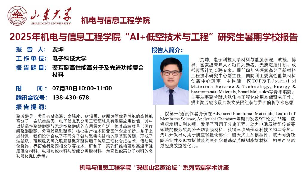 学术预告 | 机信学院“玛珈山名家论坛”:聚芳醚高性能高分子及先进功能复合材料