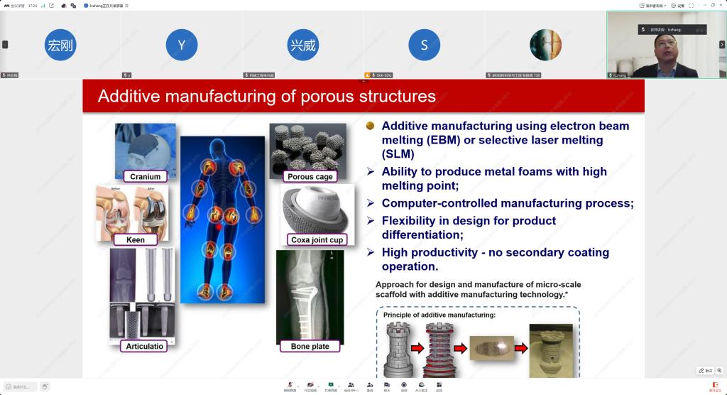 张来昌教授在报告中介绍了周期性蜂窝材料的增材制造技术,分析了增材制造钛合金晶格结构的机械行为。通过选区激光熔融 (SLM) 和电子束熔化 (EBM) 制备的贝塔型生物医学钛晶格结构作为潜在的承重植入物,在高超弹性、低杨氏模量和高强度、高能量 吸收和疲劳性能等方面表现出优异的机械性能。此外,张教授还利用SLM制备的多孔铁基金属玻璃复合材料,获得了优异的整体催化能力,具有高反应速率常数和低活化能。报告提出SLM生产的多孔铁基金属玻璃基复合材料的可重复使用性和整体催化能力有望设计出具有实际应用和高经济价值的新一代催化剂。