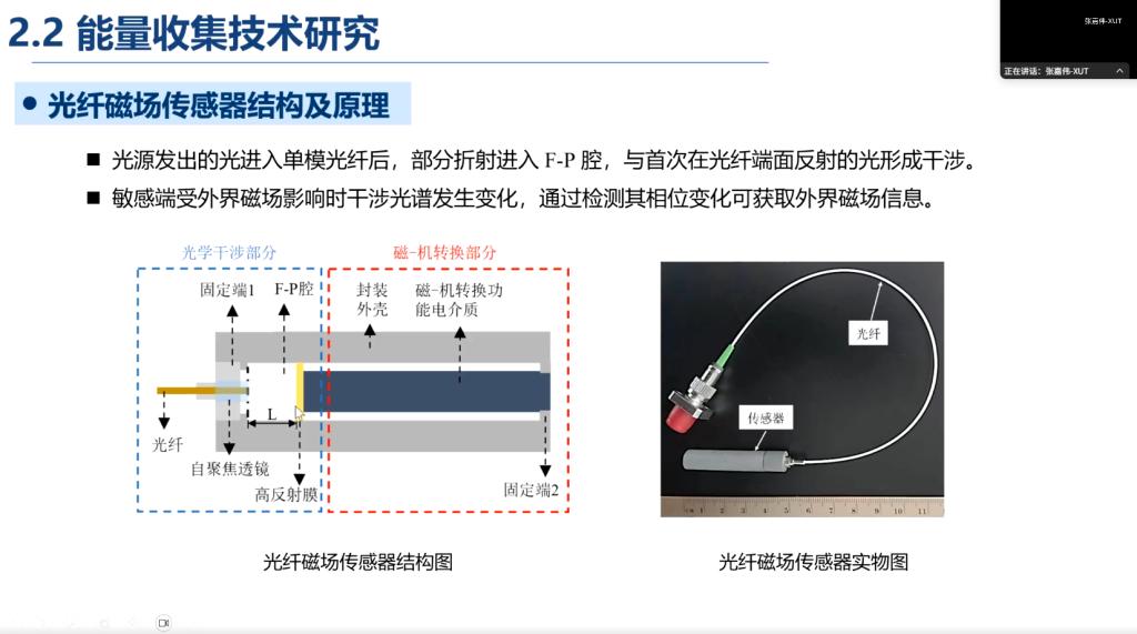 聚焦新能源互联场景下的光学传感技术,张嘉伟系统梳理了其团队在光纤干涉类传感器设计与工程应用方面的研究进展。他重点介绍了光纤磁场传感器、电场极化传感器、静电传感器等核心成果,展示了光纤干涉原理在提高传感器灵敏度、稳定性和环境适应性方面的优势。例如,其团队研发的基于法布里-珀罗干涉原理的光纤磁场传感器,灵敏度高达341皮米/毫高斯,量程覆盖0–100毫高斯;电场极化实验则验证了三角波极化方式下更高的能量收集效率,为光伏组件电荷控制提供了新思路;全球首台光纤静电传感器已实现正负电荷非接触测量,测试了多种绝缘材料摩擦起电特性,精度达到皮米级。