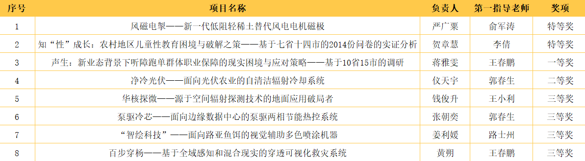 《风磁电掣——新一代低阻轻稀土替代风电电机磁极》《知‘性’成长:农村地区儿童性教育困境与破解之策——基于七省十四市的2014份问卷的实证分析》2件作品获特等奖,《声生:新业态背景下听障跑单群体职业保障的现实困境与应对策略——基于10省15市的调研》1件作品获一等奖,《净冷光伏——面向光伏农业的自清洁辐射冷却系统》1件作品获二等奖,《华核探微——源于空间辐射探测技术的地面应用破局者》《泵驱冷芯——面向边缘数据中心的泵驱两相节能热控系统》《‘智绘科技’——面向路亚鱼饵的视觉辅助多色喷涂机器》《百步穿杨——基于全域感知和混合现实的穿透可视化救灾系统》4件作品获三等奖。